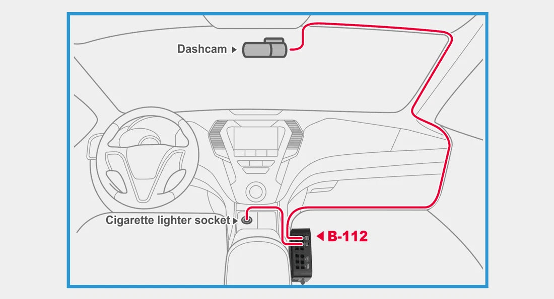 The **BlackVue B-112** is the easiest way to add Parking Mode to your dash cam setup. Designed for hassle-free installation, this battery pack simply plugs into your vehicle's cigarette lighter socket—no hardwiring required. It recharges while you drive and powers your dash cam for up to **12 hours** when parked, protecting your car's main battery from discharge.