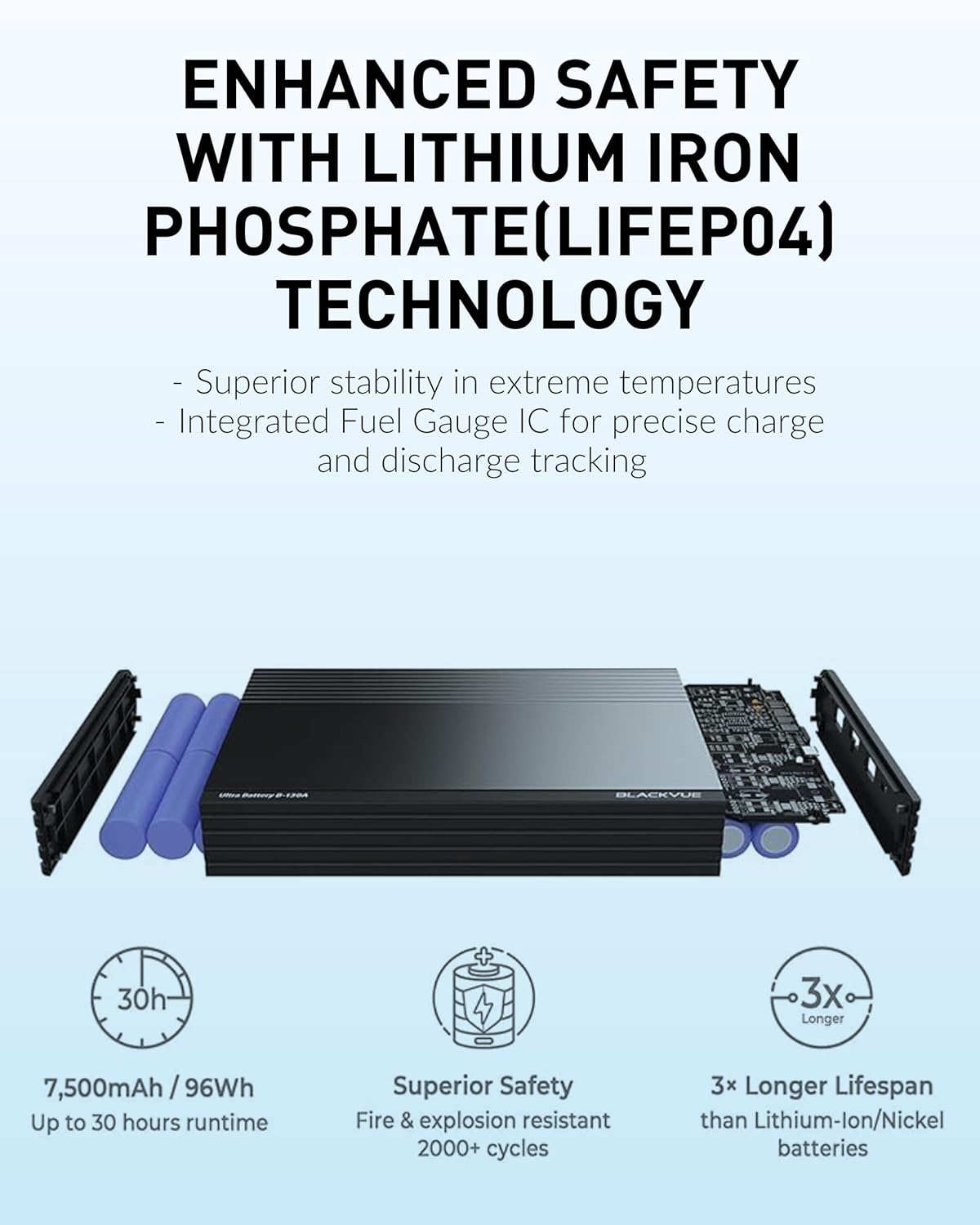 - Smart App Management: Built-in Bluetooth connects to the BlackVue App, allowing you to monitor battery % and remaining recording time in real-time.